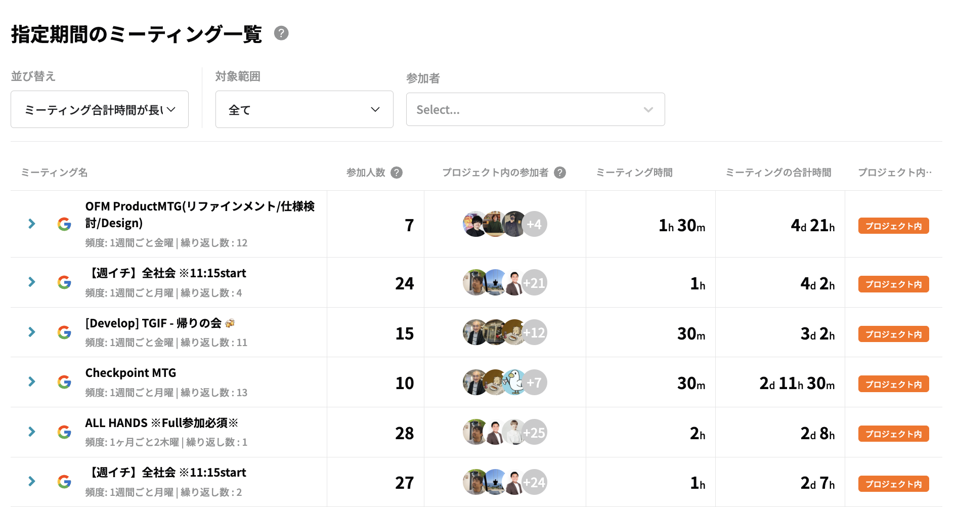 - 会議の参加者、累積の時間、チーム(プロジェクト)での会議かが閲覧できる