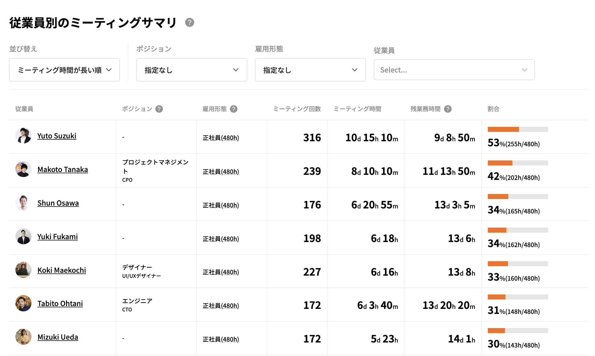 - ミーティング時間・回数での並び替え、ポジションでのフィルター、雇用形態別、従業員ごとなどの絞り込みができる