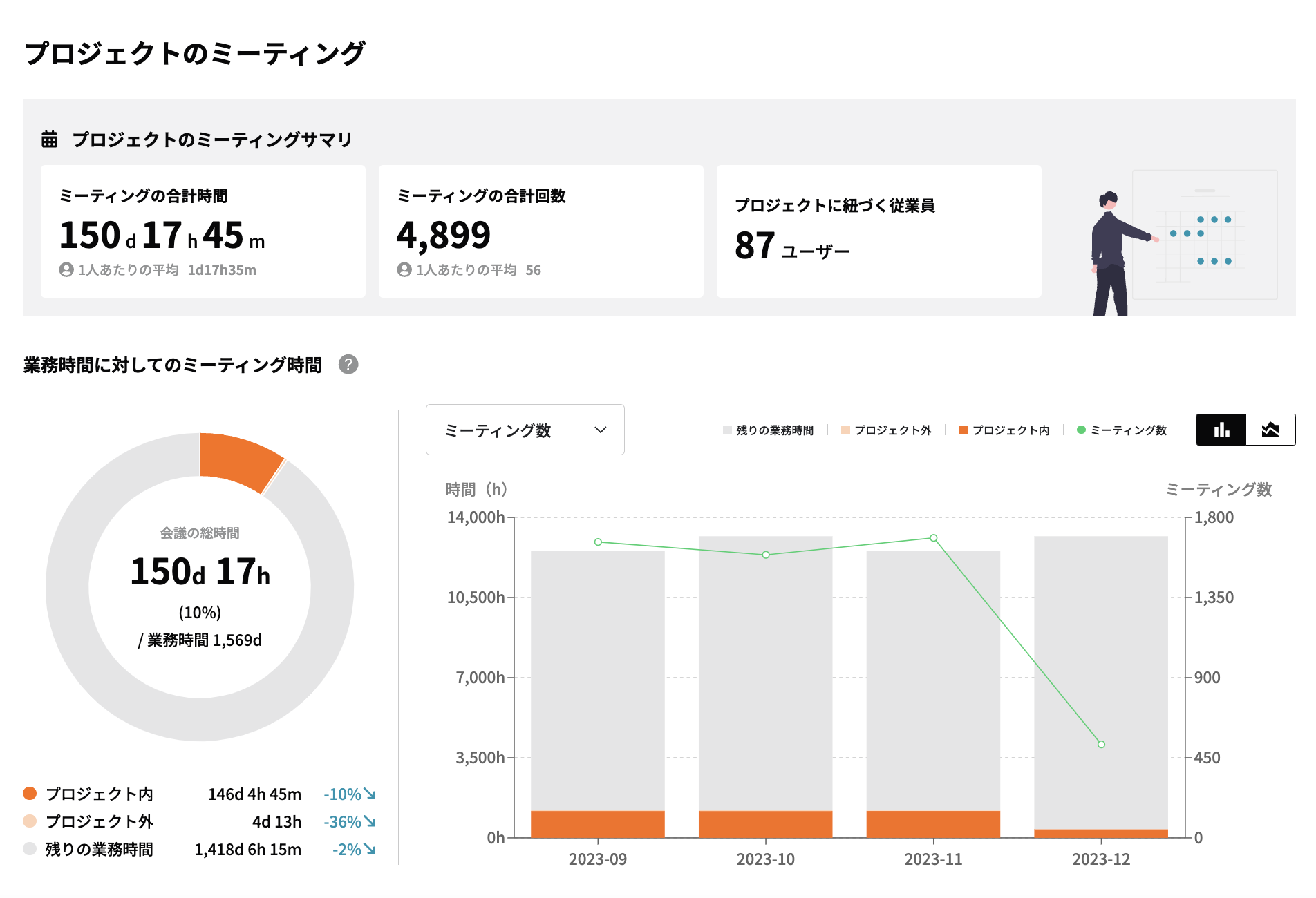 - 会議ごとの時間、回数、会議の時間がどれくらい業務の中で占めているのか閲覧できる
